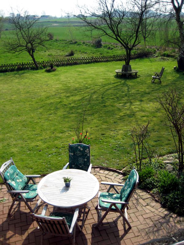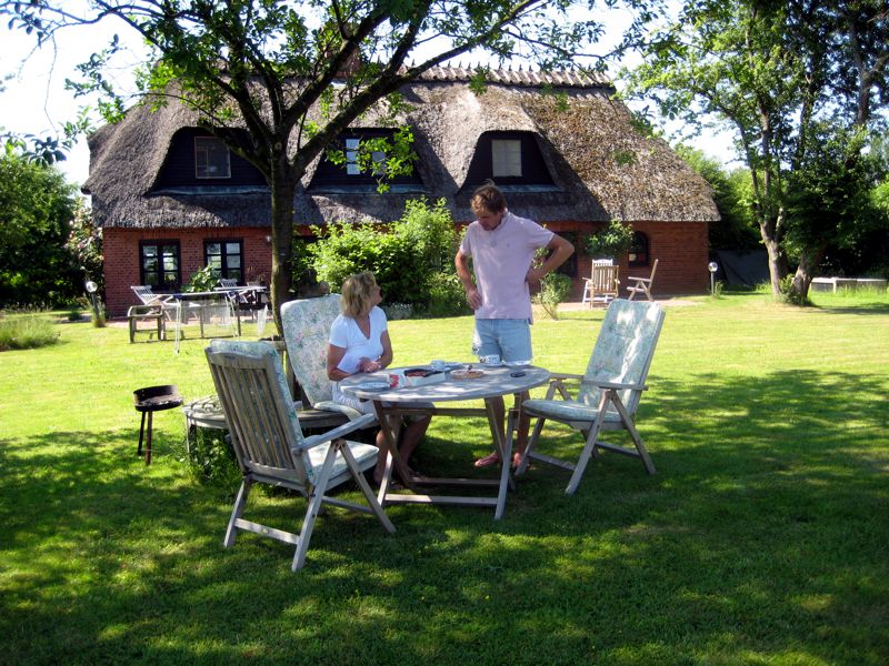 Auf dem weitläufigen Grundstück bieten sich außer einer gepflasterten Terrasse, reizvolle Ruheplätze an, von denen der Blick zum Haus, dem Teich oder über die grüne Koppel bis zum typischen Knick geht, aus dem in der Dämmerung die Rehe bis nah ans Haus kommen können.